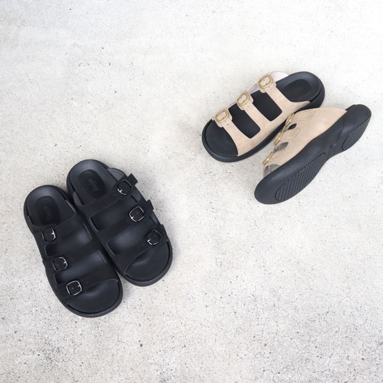 Mサイズ(25-26cm)Lサイズ(26-26.5cm) 程よいボリューム感のソールと3本ベルトのデザインが印象的なコンフォートサンダル。