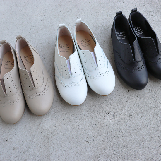 RecipeのロングセラーRP-204 Lカットスリッポンや、ゆったりビットローファー RP-530と同じ木型を使用しています 幅広さんにもおすすめの履き心地。 カップインソールはクッション性が良く、また取り外しが可能なのでお手持ちのインソールに変えていただくことも可能です。